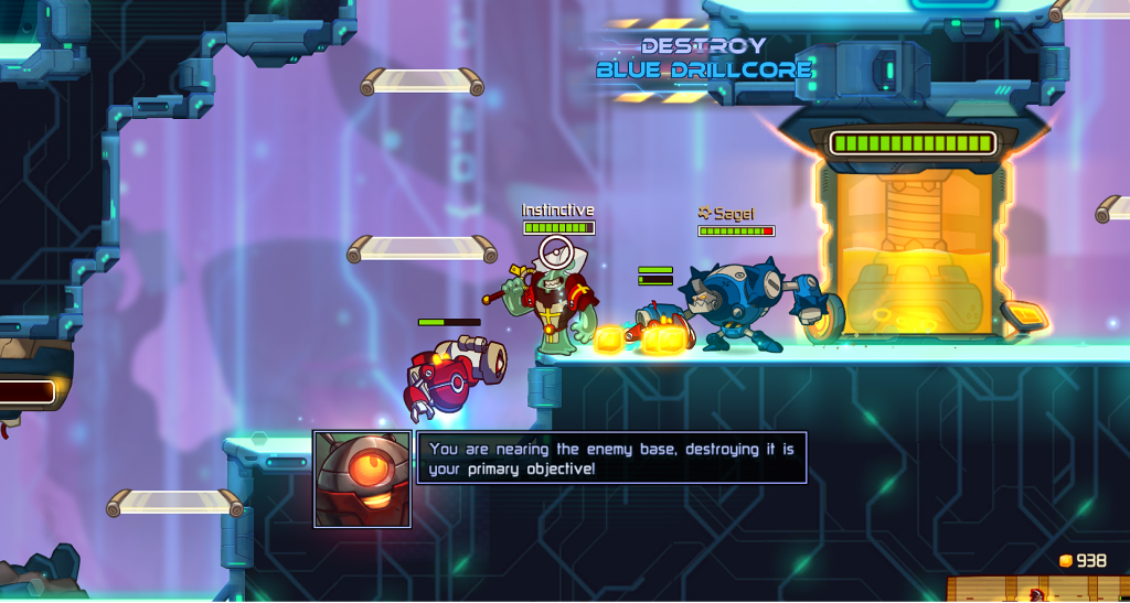 So, Awesomenauts is a DOTA of the 2d sidescroller variety. The art is bright and happy, the world is fun to hop around in (although like cuphead, I find the agility and responsiveness of the characters a little low). I hopped into this and after a brief tutorial against bots I was stomping away in PvP zapping little minions and trying to snipe enemy players with some mish-mash of randomly upgraded powers.